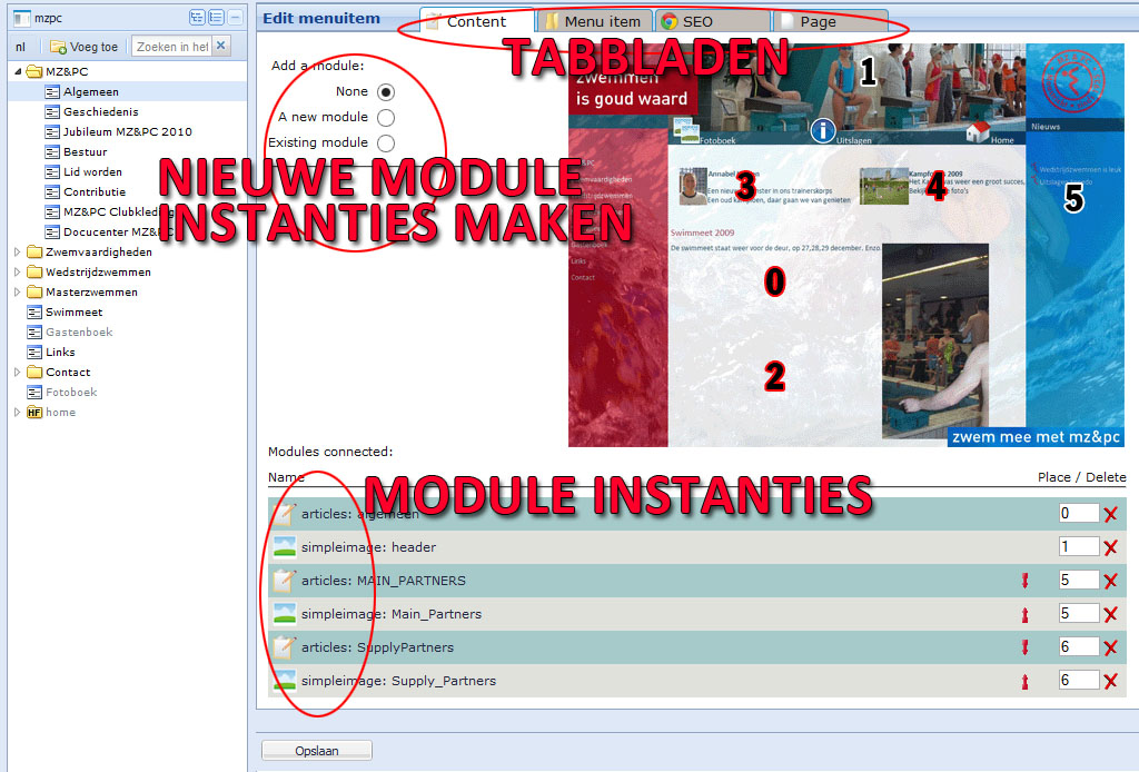 Door de afbeelding met de nummers erop is te zien op welk deel van de pagina welke modules geactiveerd zijn of geactiveerd kunnen worden. Onderaan staan de modules die op deze pagina geactiveerd zijn. Achter iedere moduleinstantie staat het nummer waarmee die plaats op de pagina correspondeert. Zoals duidelijk te zien is, en zoals ook verder op deze wiki is toegelicht is, dat er verschillende modules zijn voor verschillende functionele wensen. Iedere module is herkenbaar aan een ikoon dat voor de instantiebenaming staat. De belangrijkste en meestgebruikte modules zijn de artikelen-module (articles), de afbeeldingen-module (simpleimage), de formulieren-module (forms) en de Fotogallerij-module (photogallery). Voor een uitgebreide beschrijving van de werking van deze modules verwijzen wij naar de respectievelijke pagina's in deze wiki.